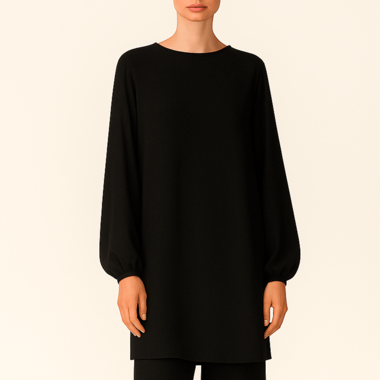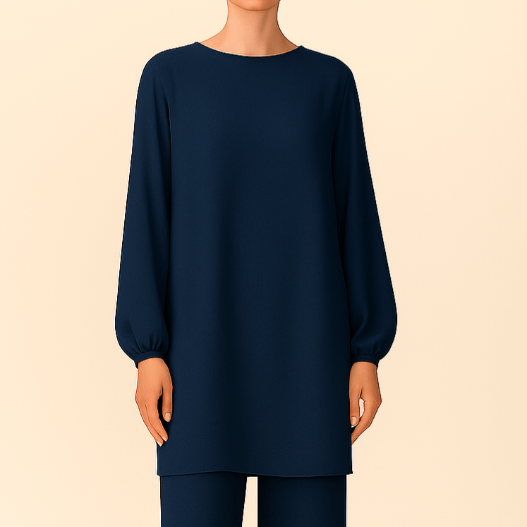 پارچه این تونیک نخی ابر و بادی است. طراحی آن جلو بسته با یقه گرد است که در قسمت پشت یوک چین دار دارد و آستین آن پفی است.