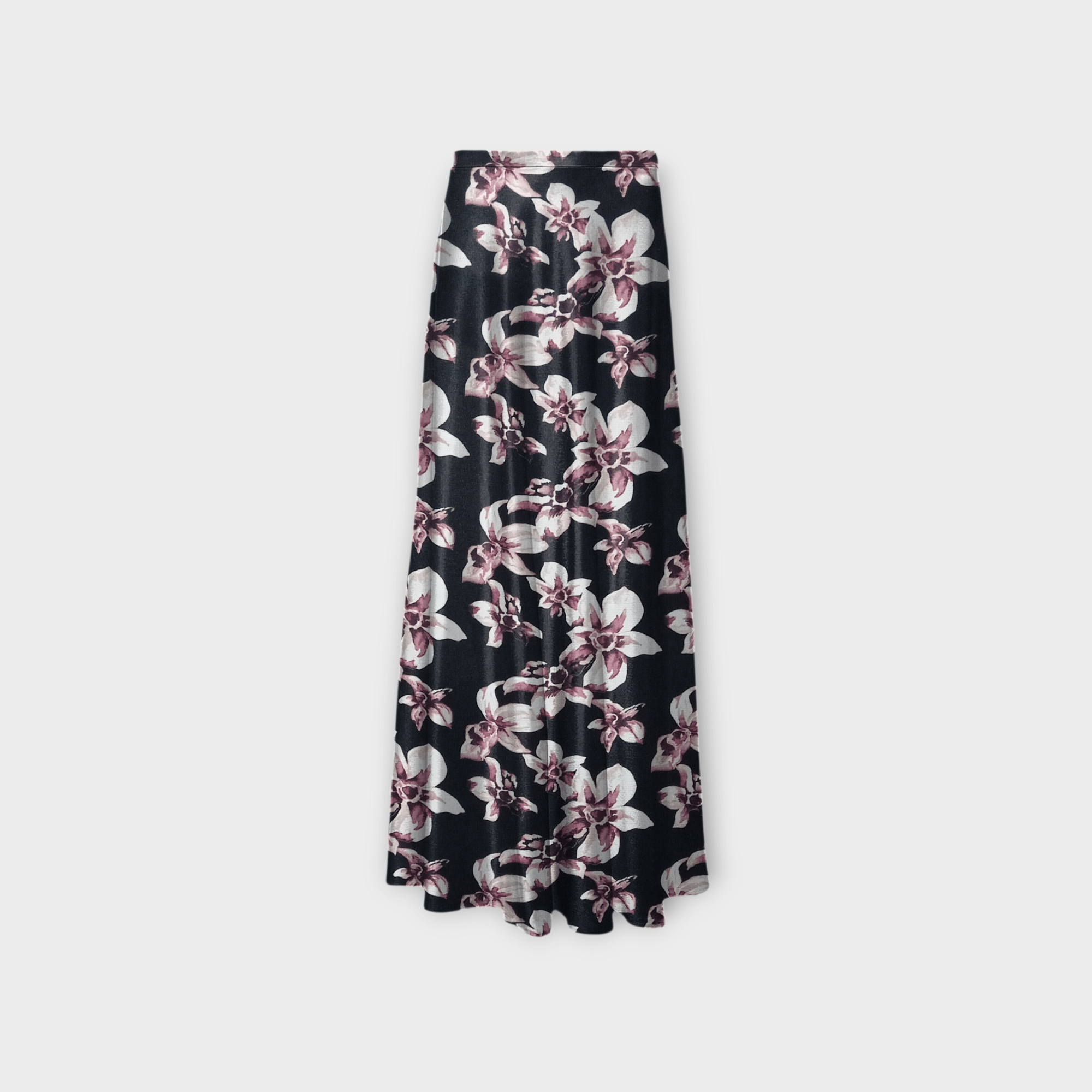 دامن بلند نیم کلوش پشت کش گل لیلیوم با زمینه مشکی کرپ نخ پفکی