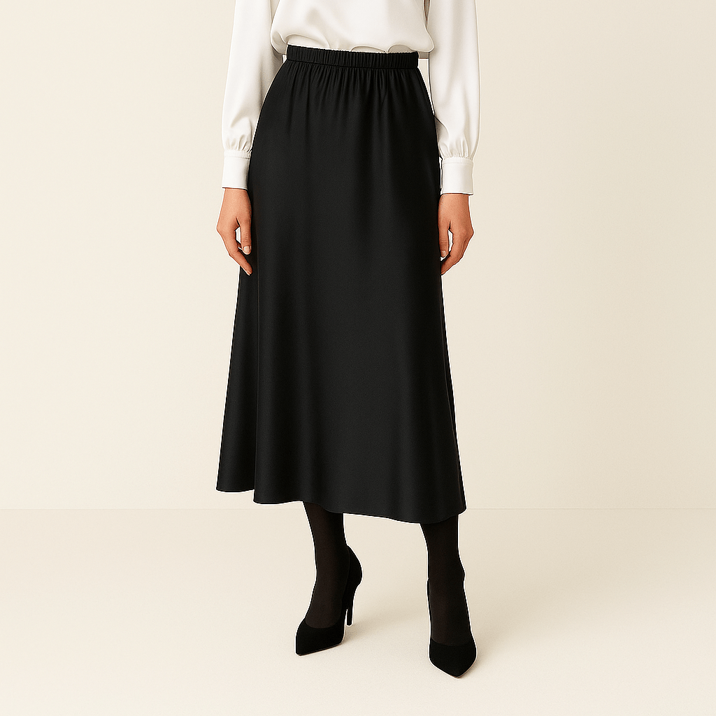 دامن ساتن کمرکش اِی لاین میدی مشکی سایز 32 تا 62 قد 80cm (رنگبندی موجود)