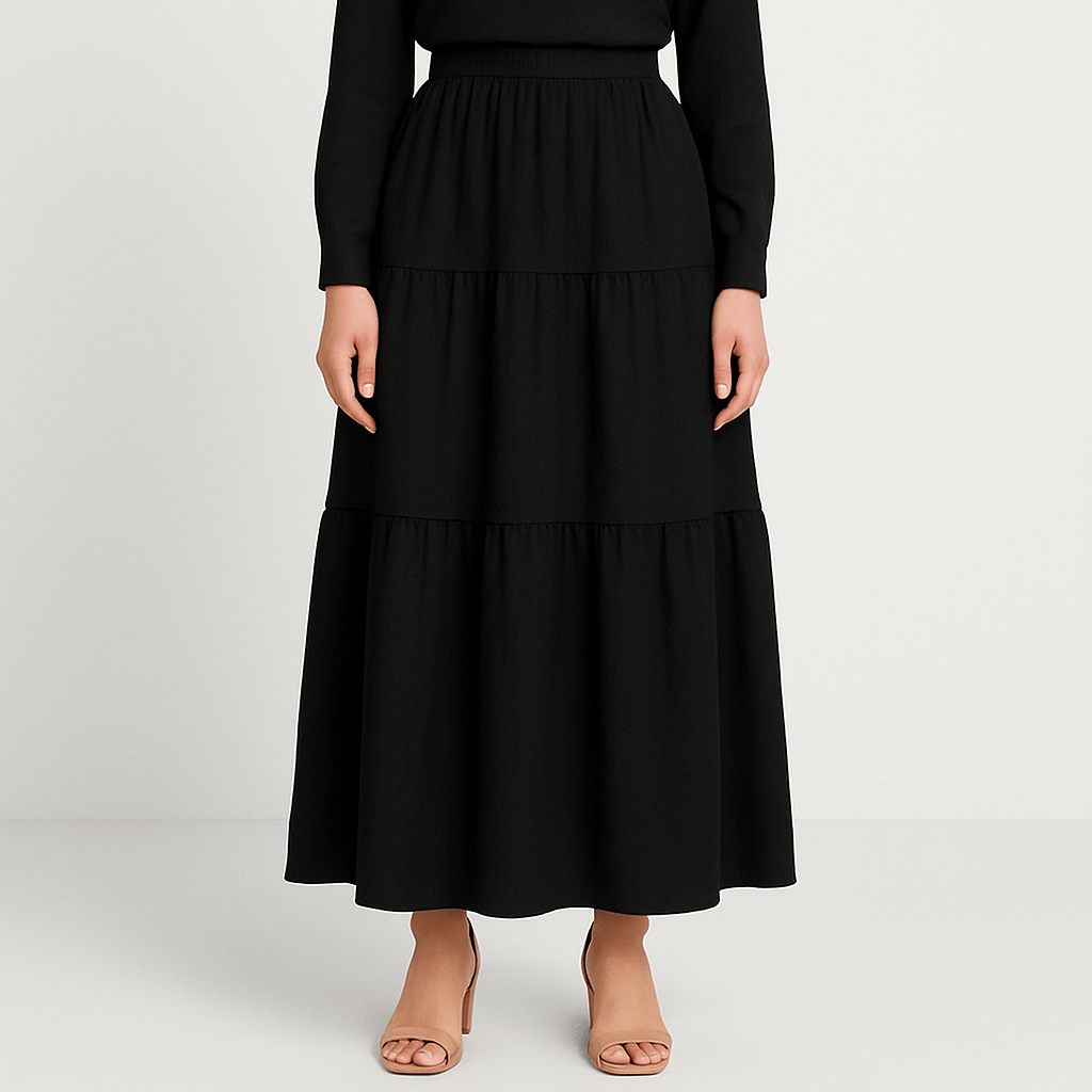 دامن سه دامنه چیندار پشت کش نخی ابروبادی مشکی قد 100cm سایز 32 تا 62