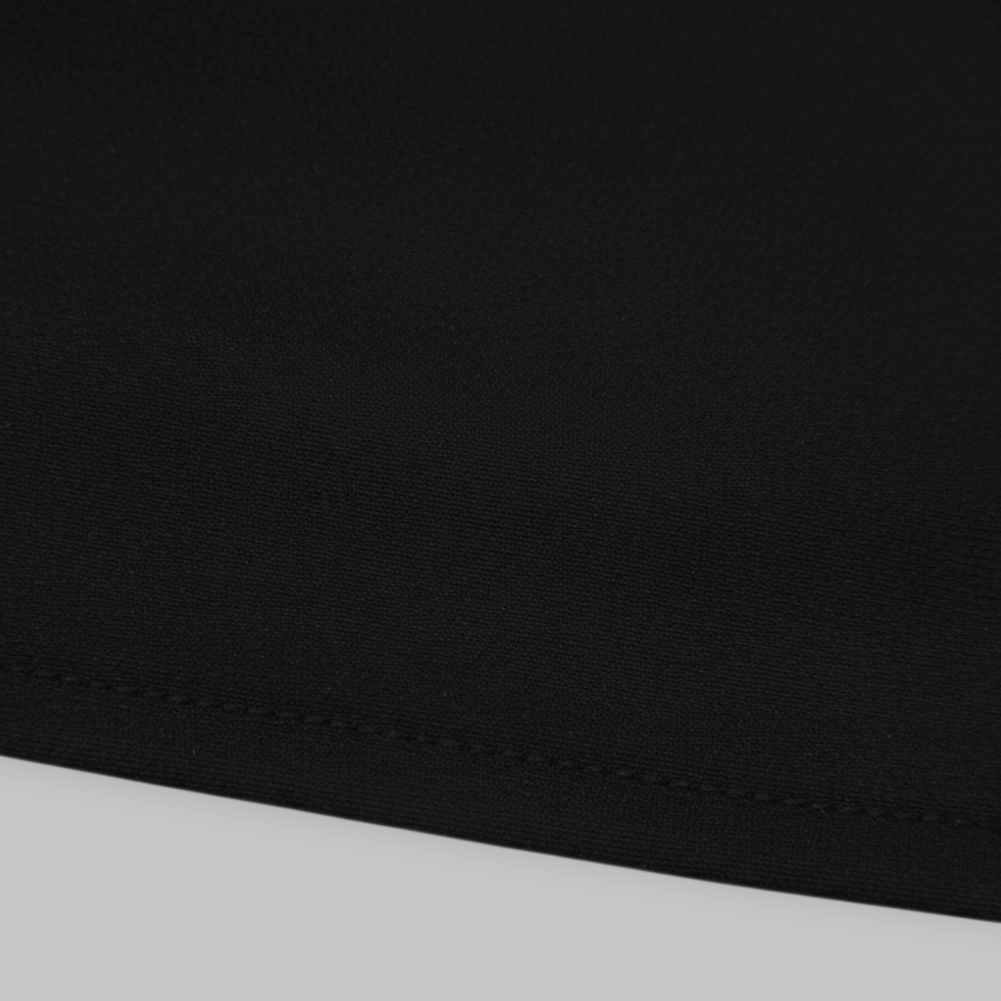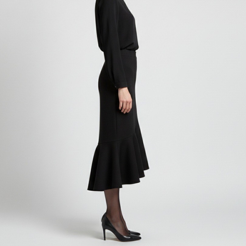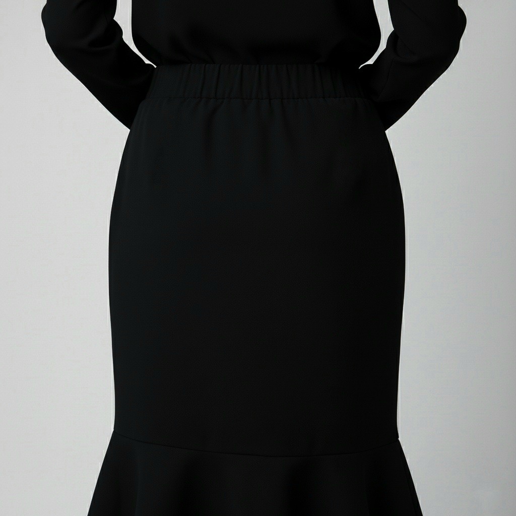 - دامن فلوئنس نامتقارن مجلسی مشکی کرپ مازاراتی با رافل فلوئنس یک طرفه و نامتقارن طراحی شده است.