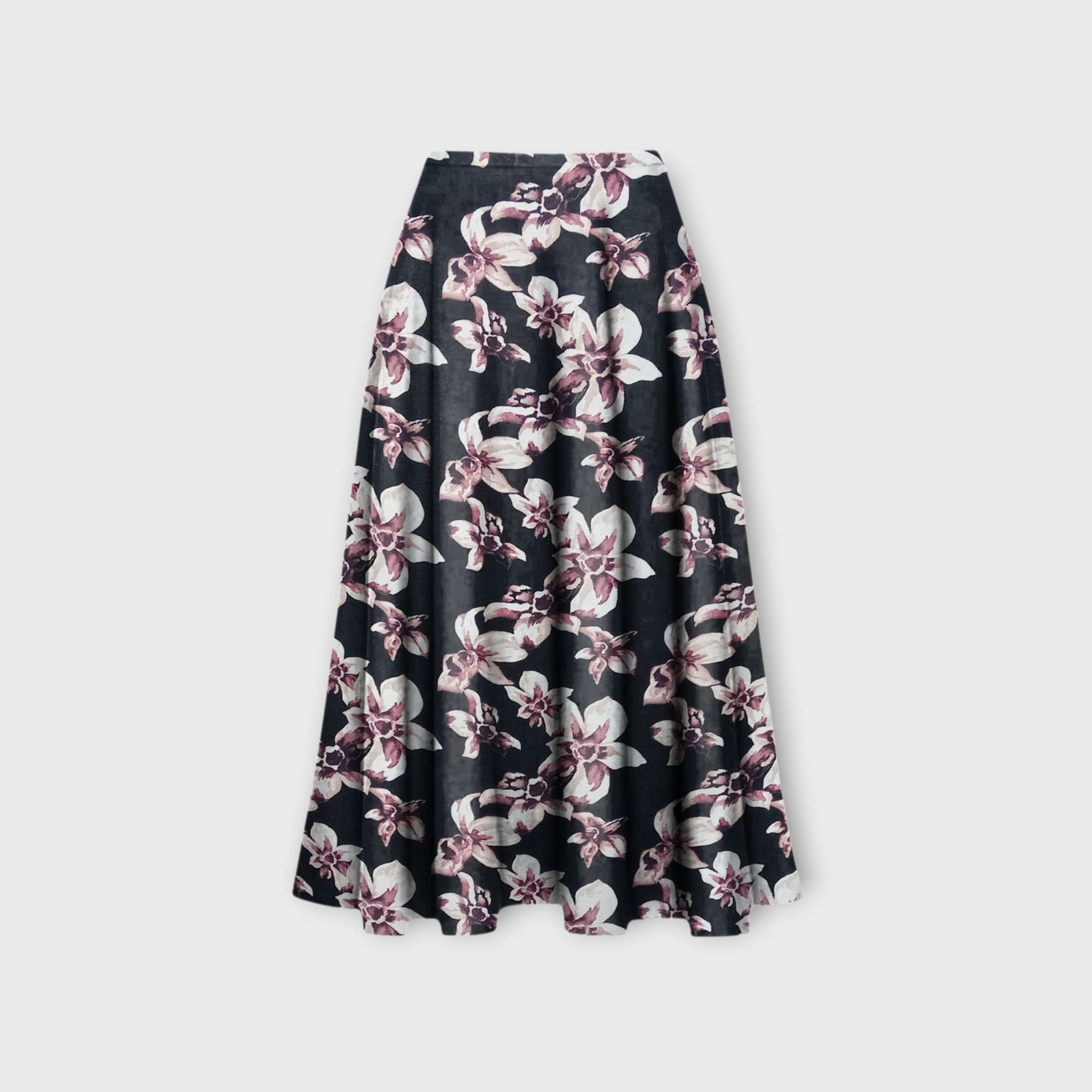دامن میدی نیم کلوش پشت کش گل لیلیوم با زمینه مشکی کرپ نخ پفکی قد 80cm سایز 32 تا 62