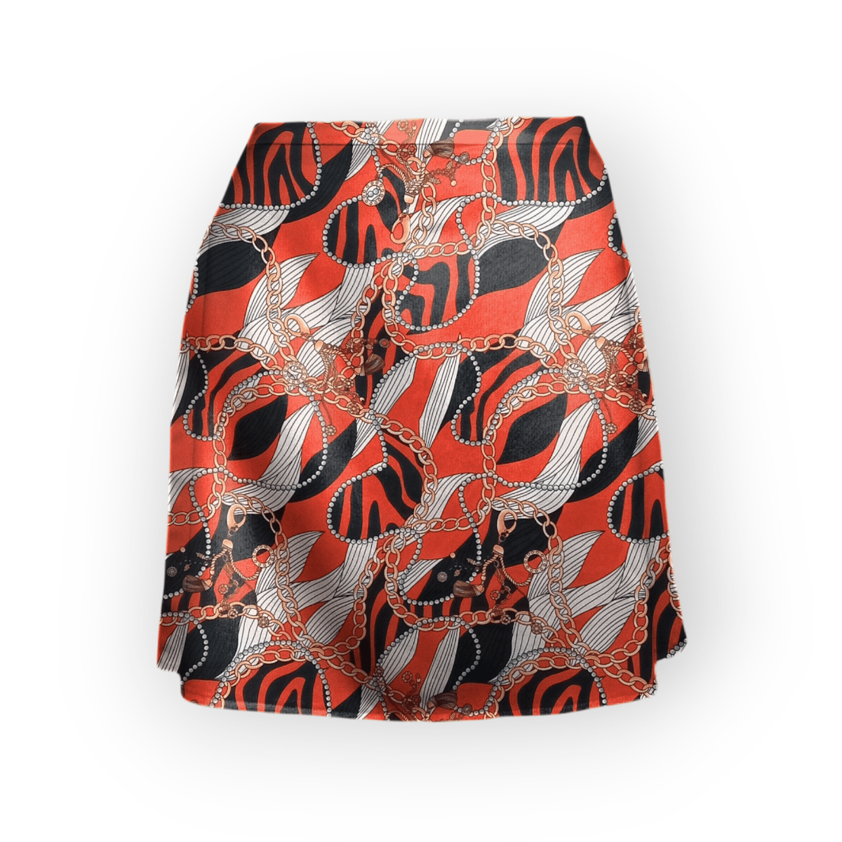 دامن کوتاه طرح زنجیر با زمینه قرمز ای لاین پشت کش کرپ نخ قد 45cm سایز 32 تا 62