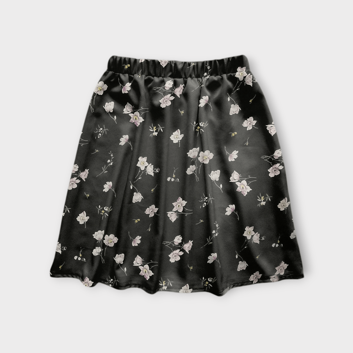 دامن کوتاه گلدار کمرکش ای لاین کرپ نخ گل آناگالیس با زمینه مشکی