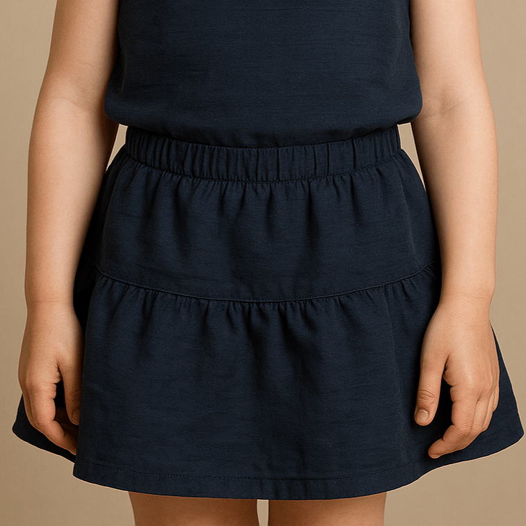 دامن کودک نخی آبی نفتی به صورت دو دامنه چین دار و کمرکش طراحی شده است.
