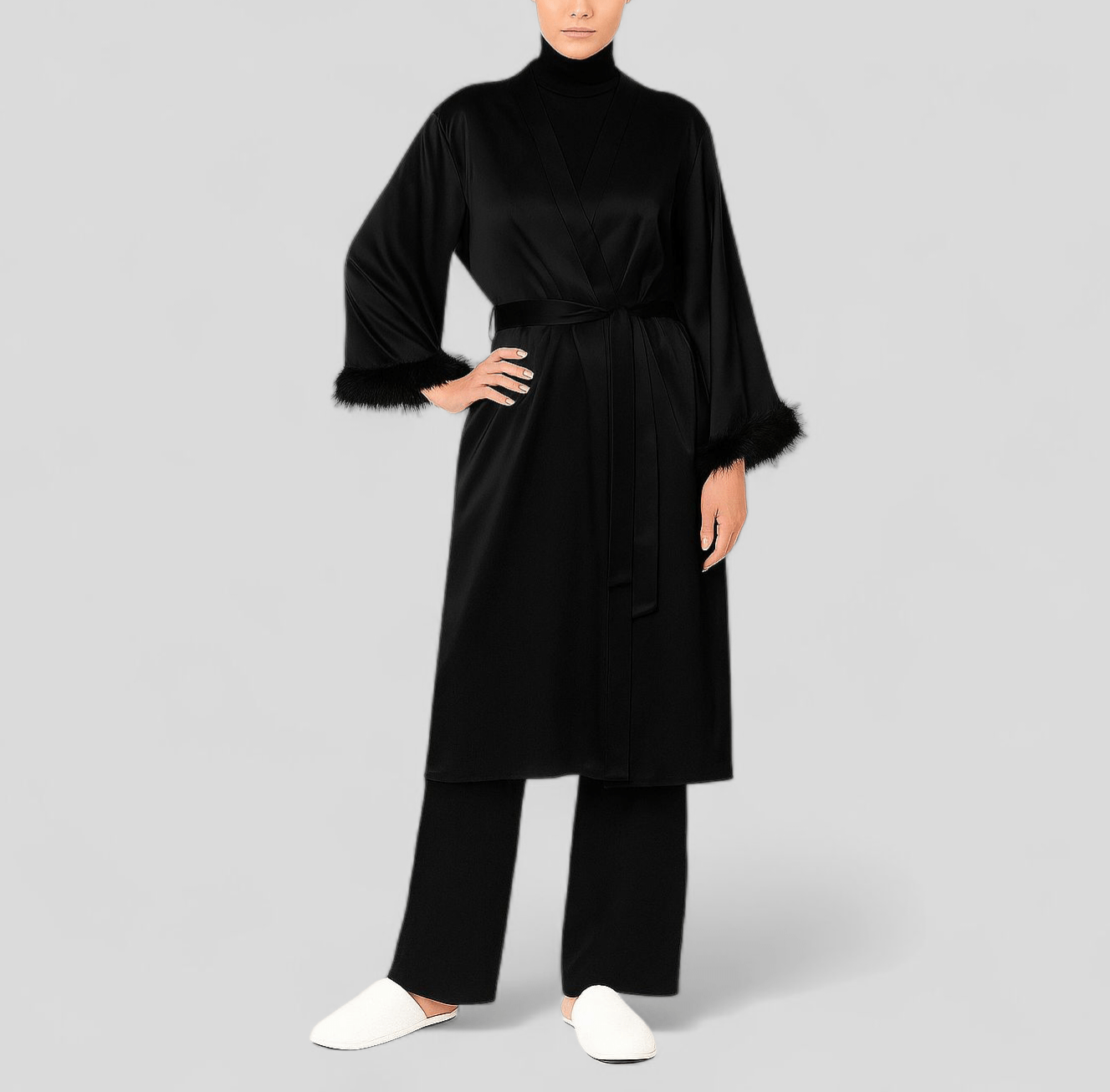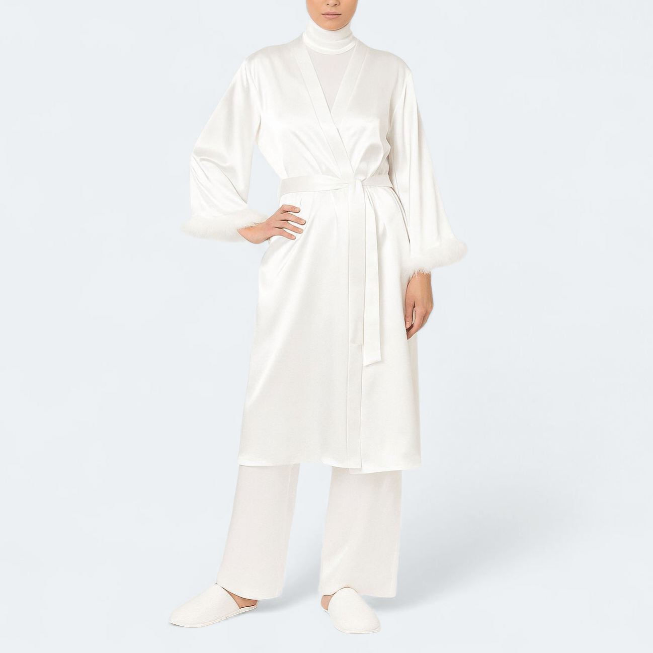 ربدوشامبر ساتن سفید پردار قد 100cm