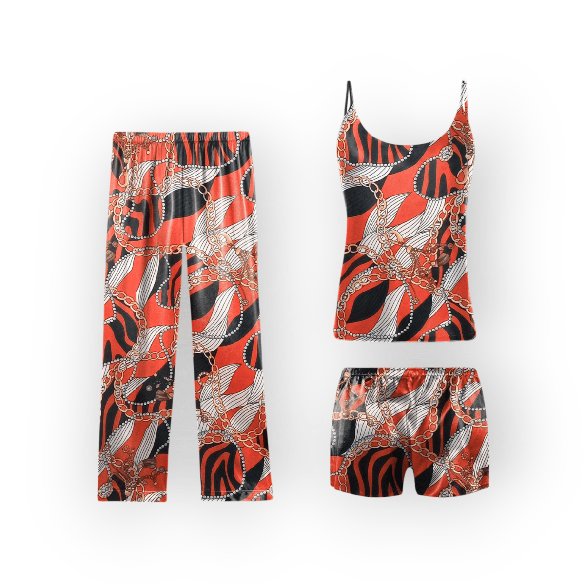 ست تاپ شلوارک شلوار طرح زنجیر با زمینه قرمز کرپ نخ