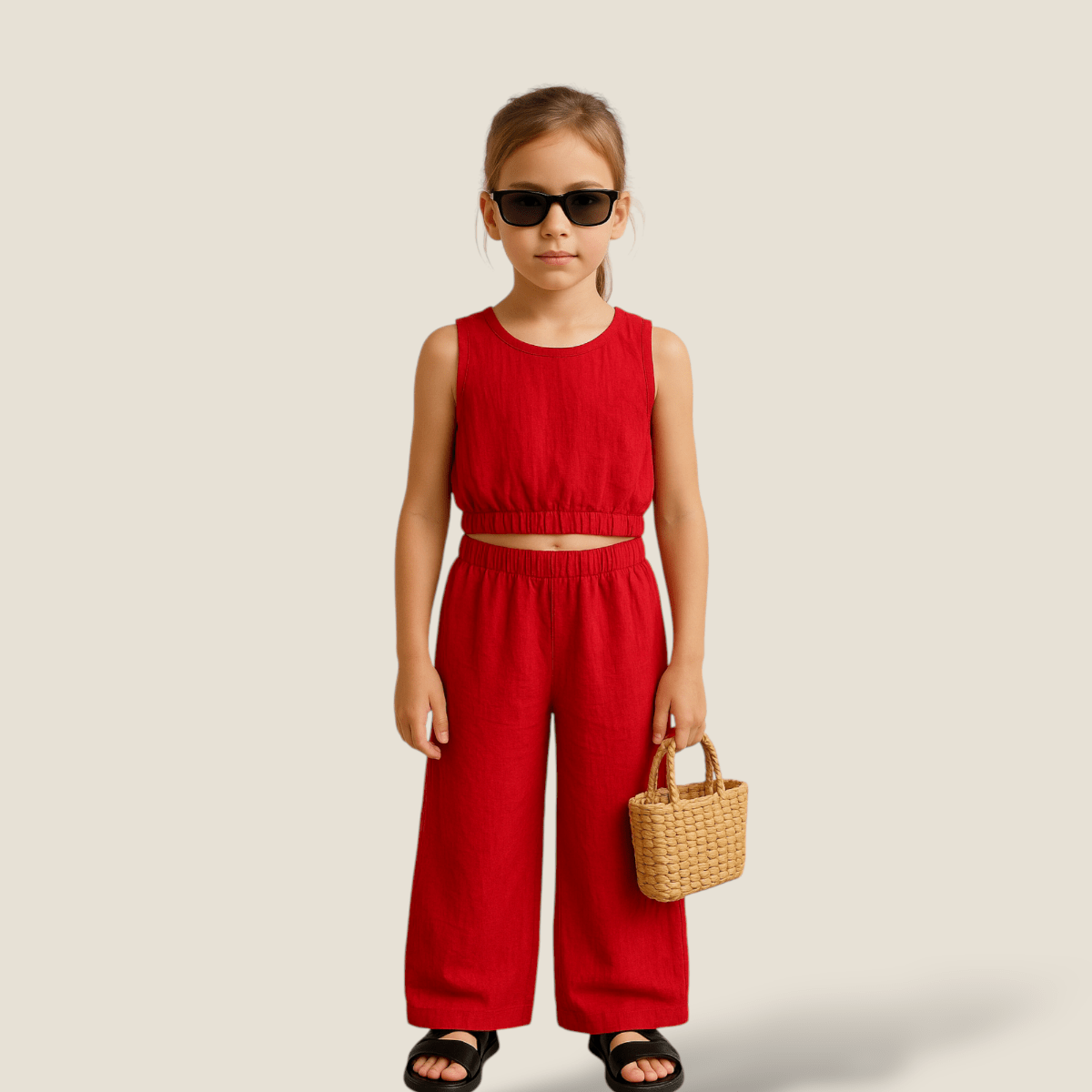 ست تاپ و شلوار کودک کمرکش نخی ابروبادی قرمز 2 تا 11 سال (رنگبندی موجود)