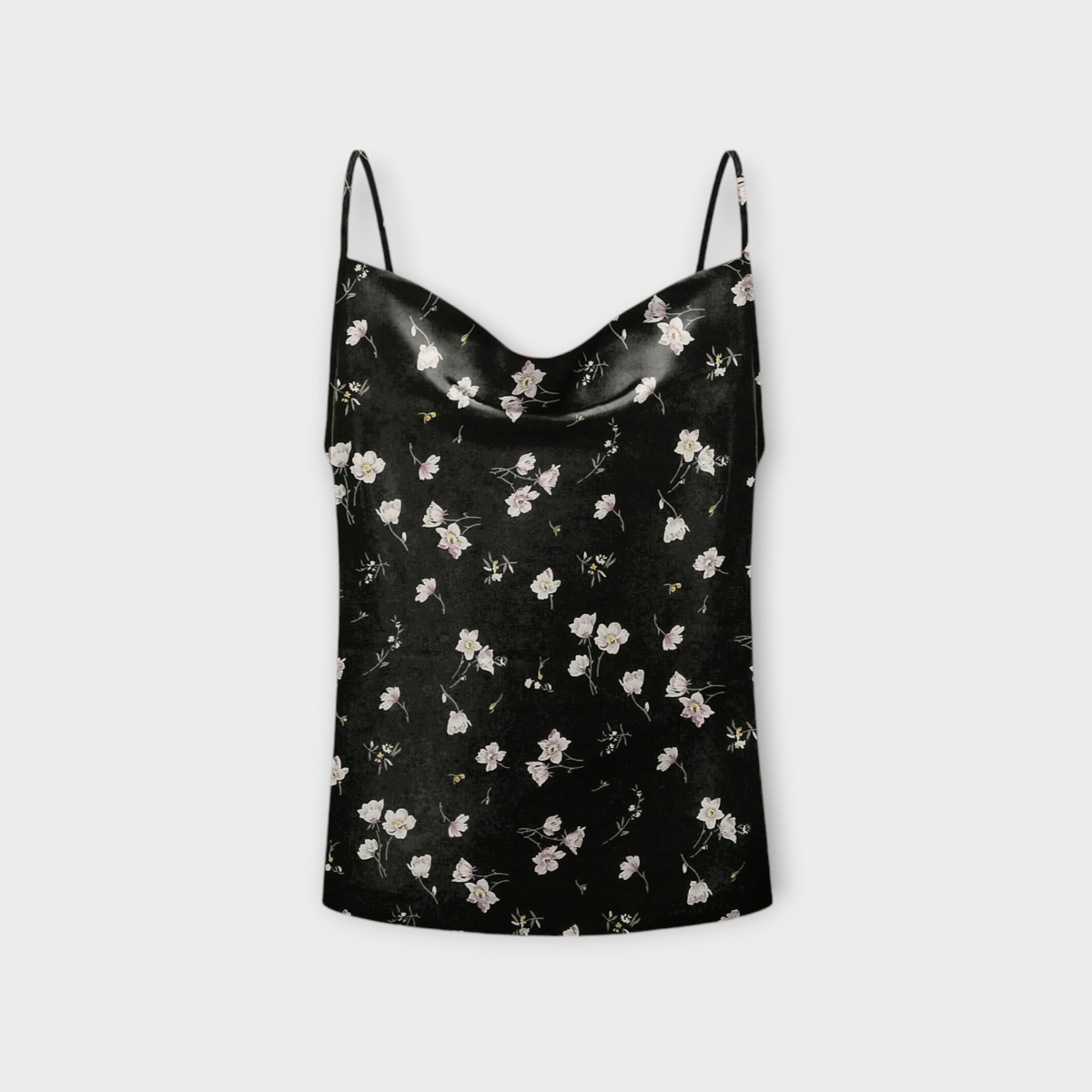 ست تاپ یقه شل و شلوار بگ گلدار کرپ گل آناگالیس با زمینه مشکی نخ