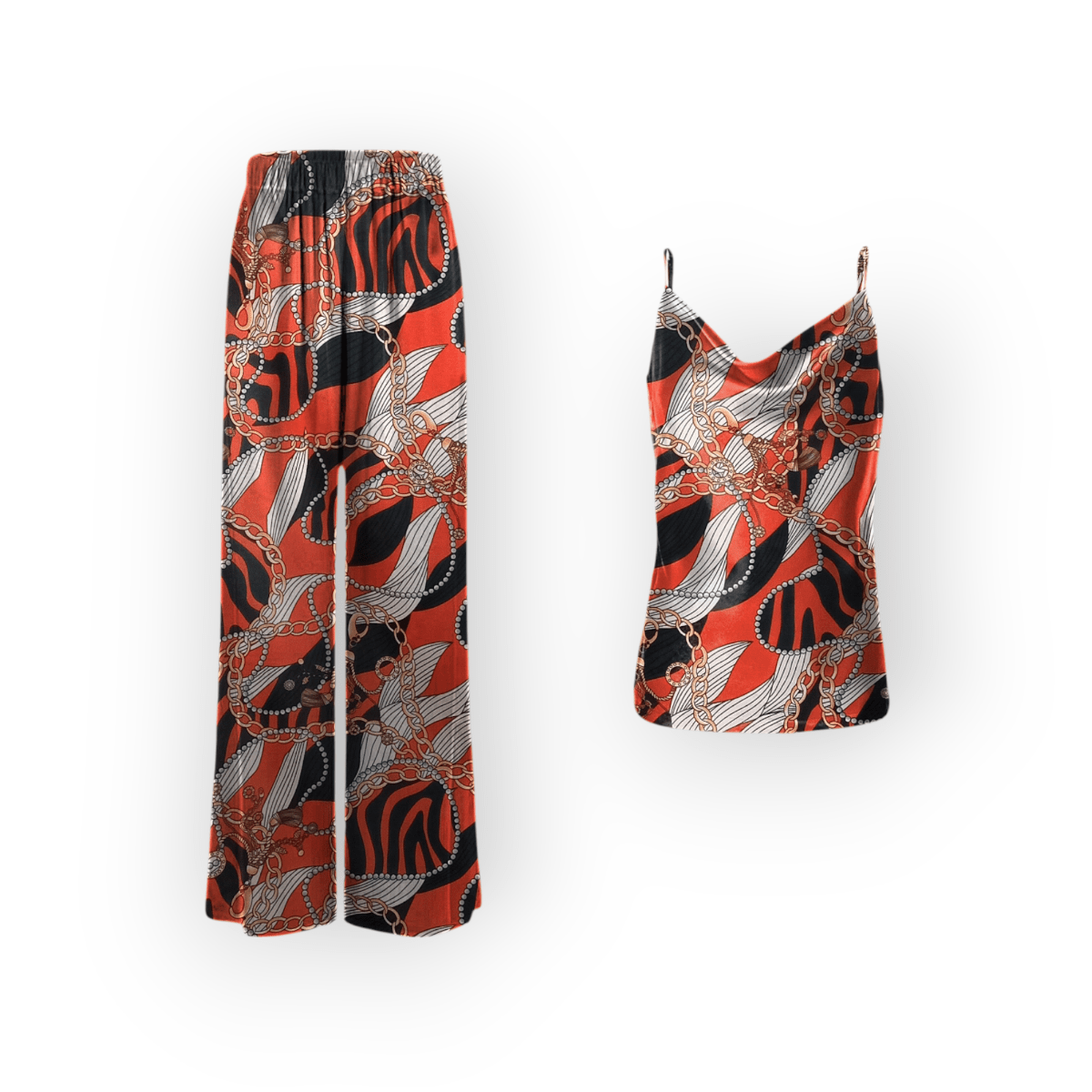 ست تاپ یقه شل و شلوار طرح زنجیر با زمینه قرمز کرپ نخ