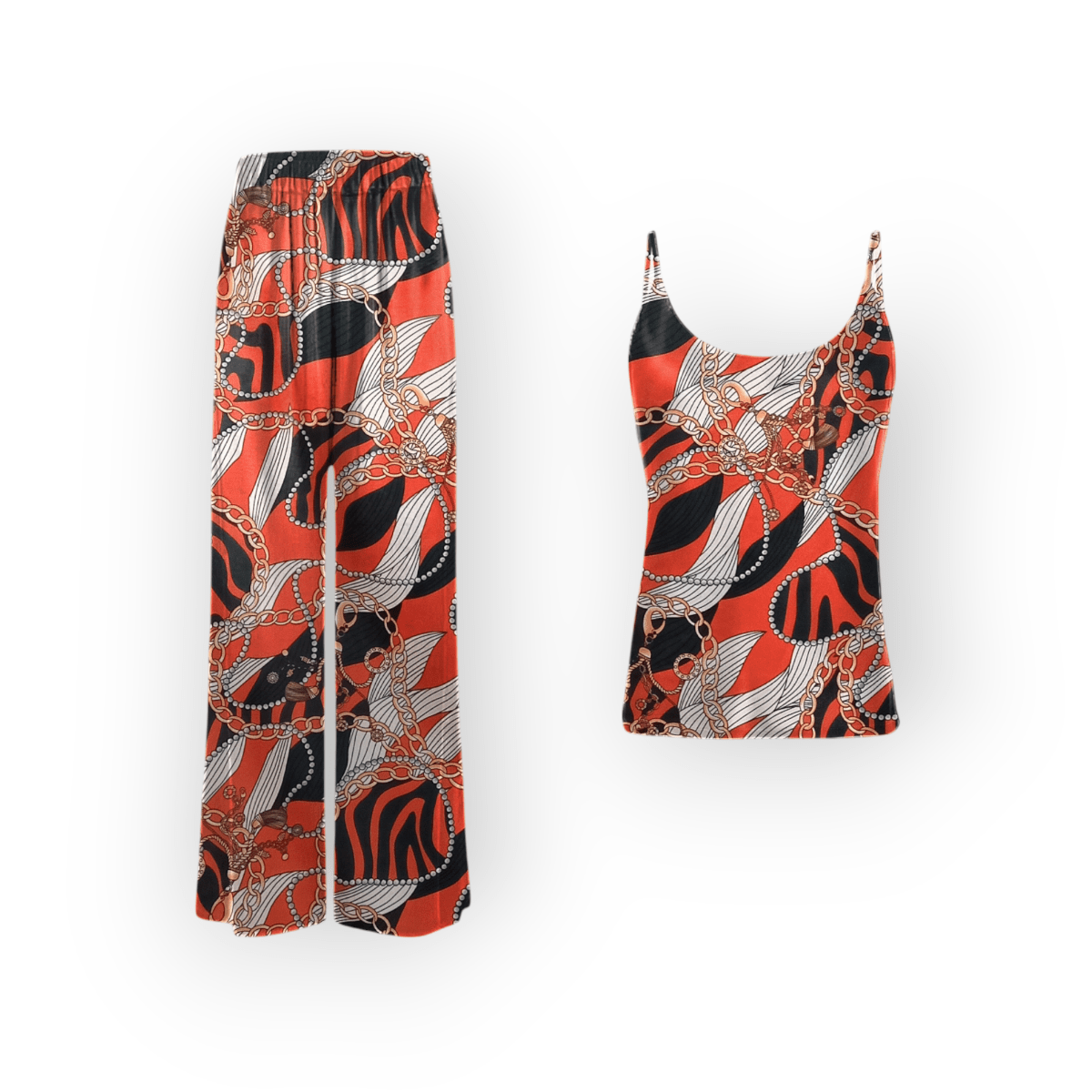 ست تاپ یقه گرد و شلوار بگ طرح زنجیر با زمینه قرمز کرپ نخ