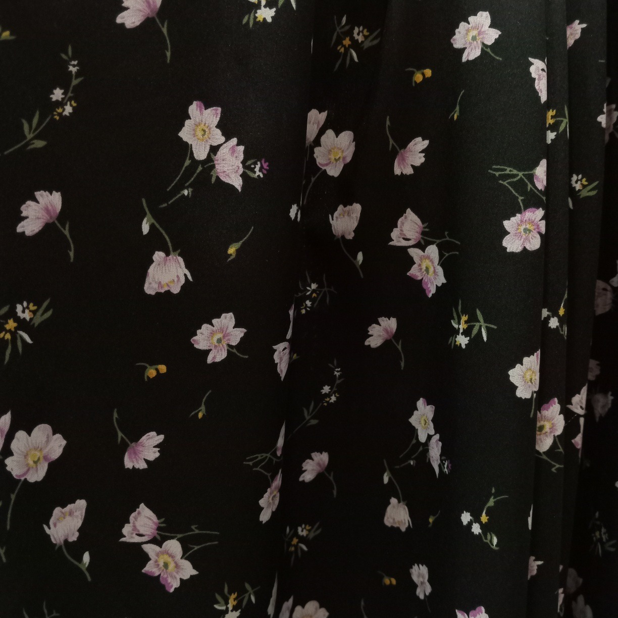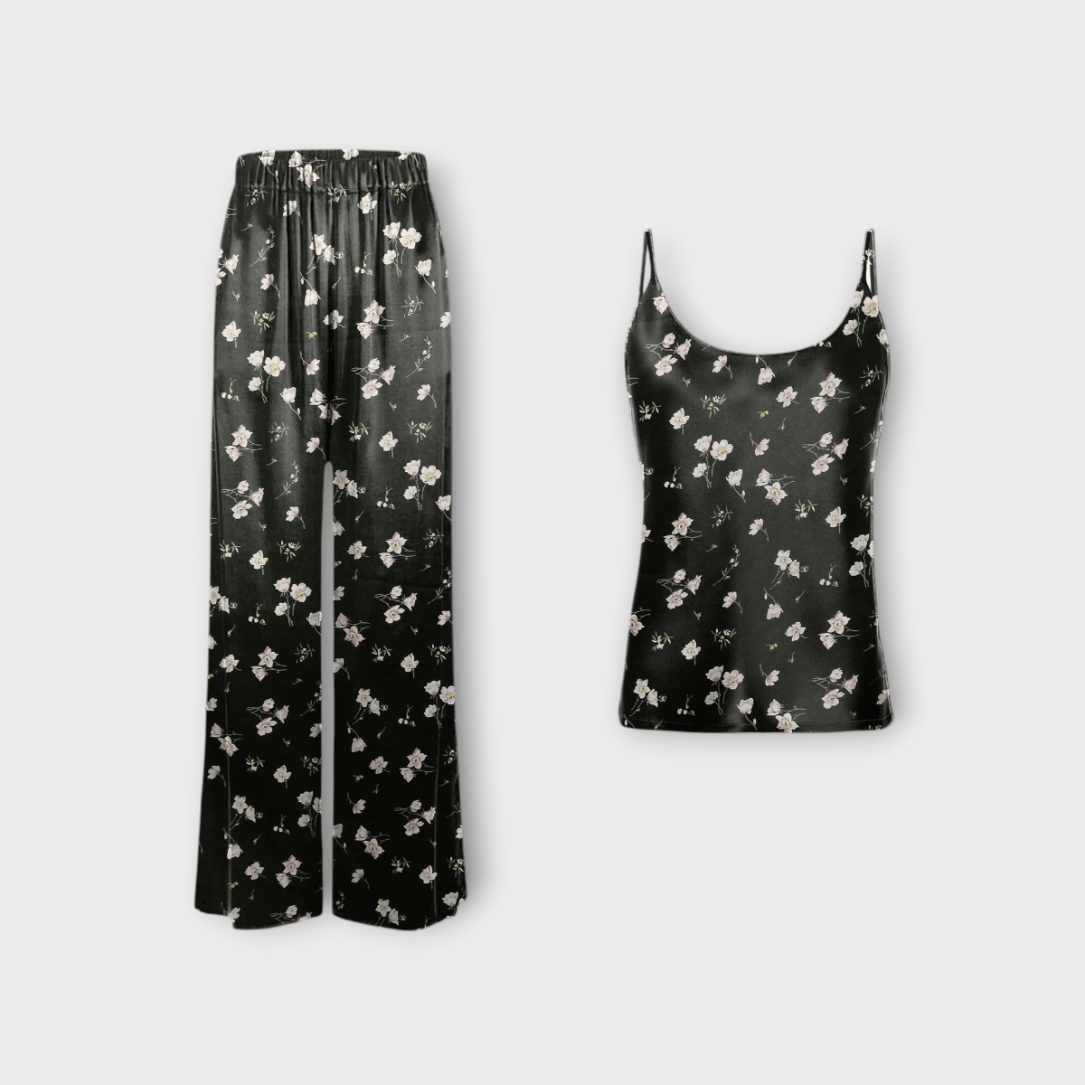 ست تاپ یقه گرد و شلوار بگ گلدار کرپ گل آناگالیس با زمینه مشکی نخ