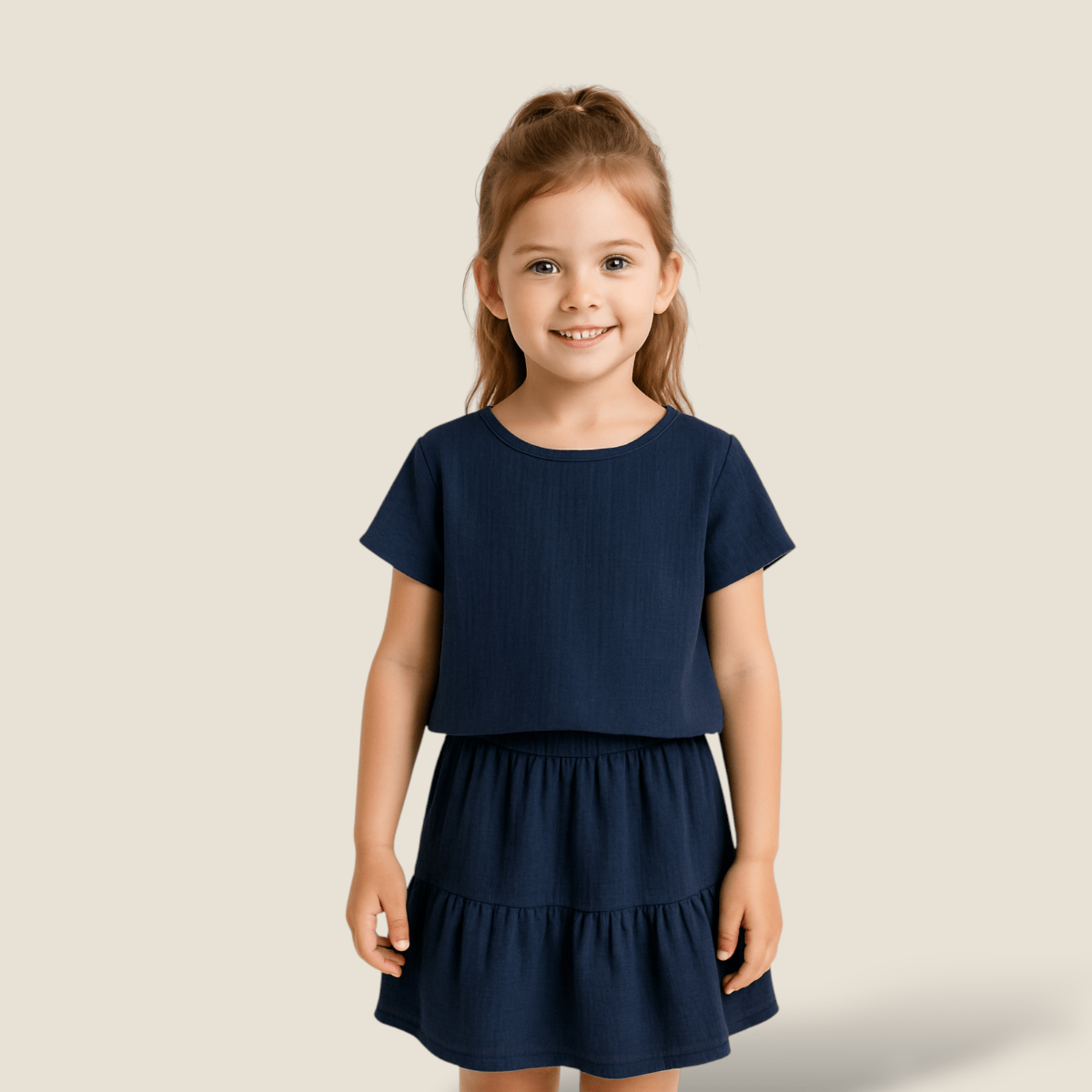 پیراهن بلند کودک سه دامنه آستین بلند نخی ابروبادی آبی نفتی 2 تا 11 سال (رنگبندی موجود)