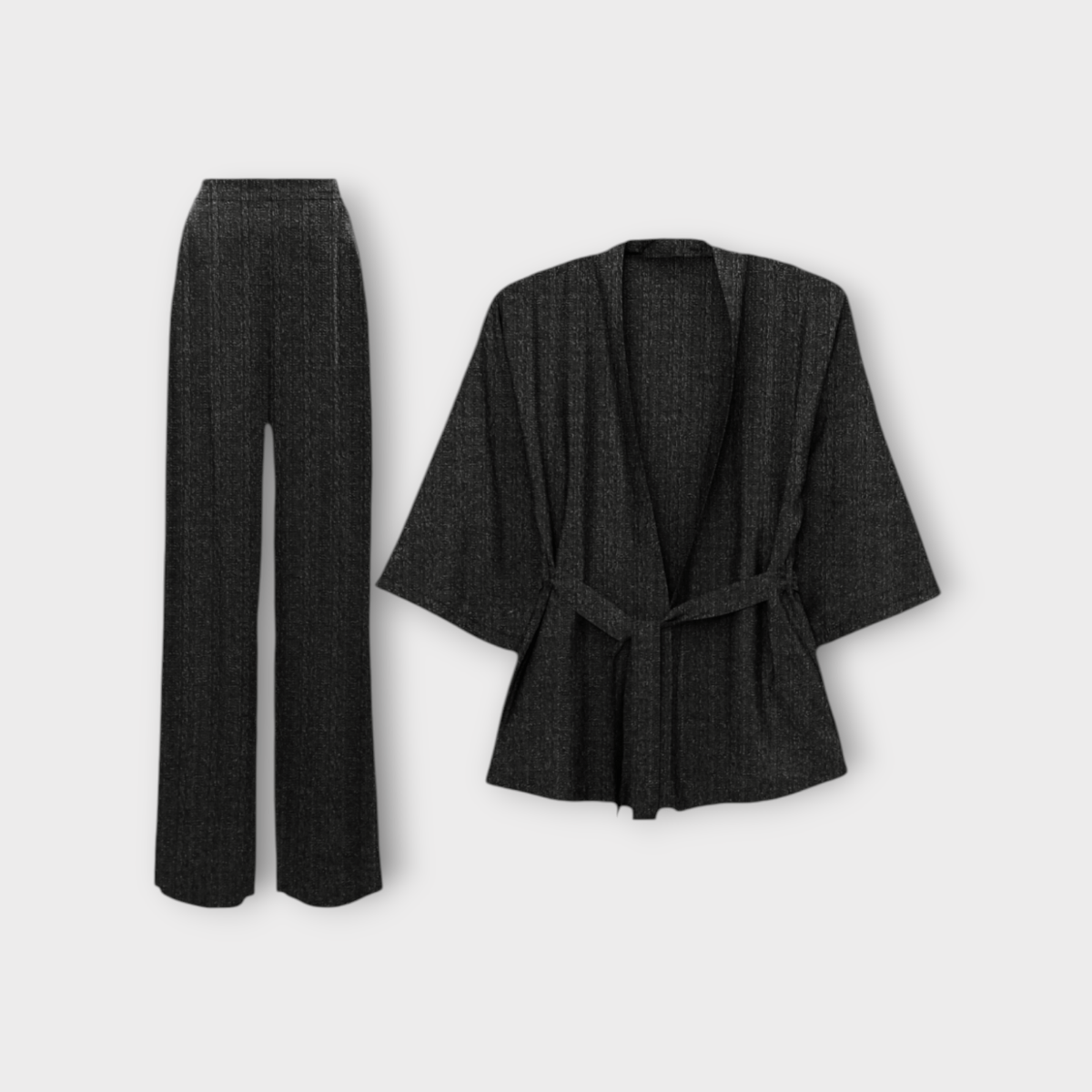 ست مانتو کیمونو و شلوار بافت طوسی سایز 32 تا 62