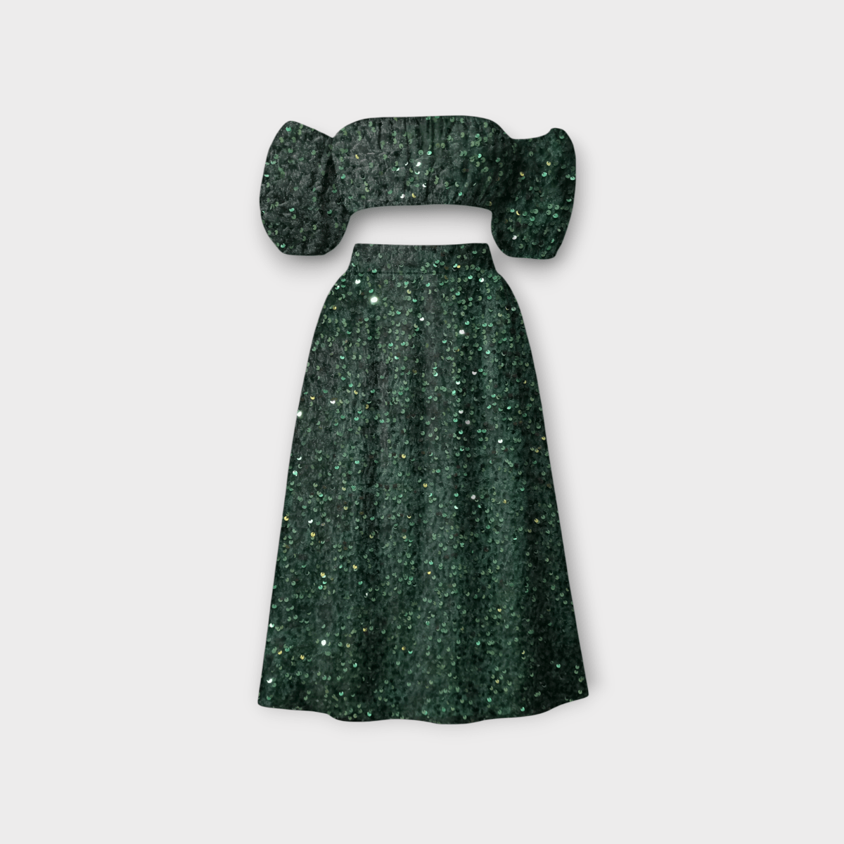 ست مخمل پولکی نیم تنه آستین جدا و دامن نیم کلوش میدی نیم کلوش مشکی
