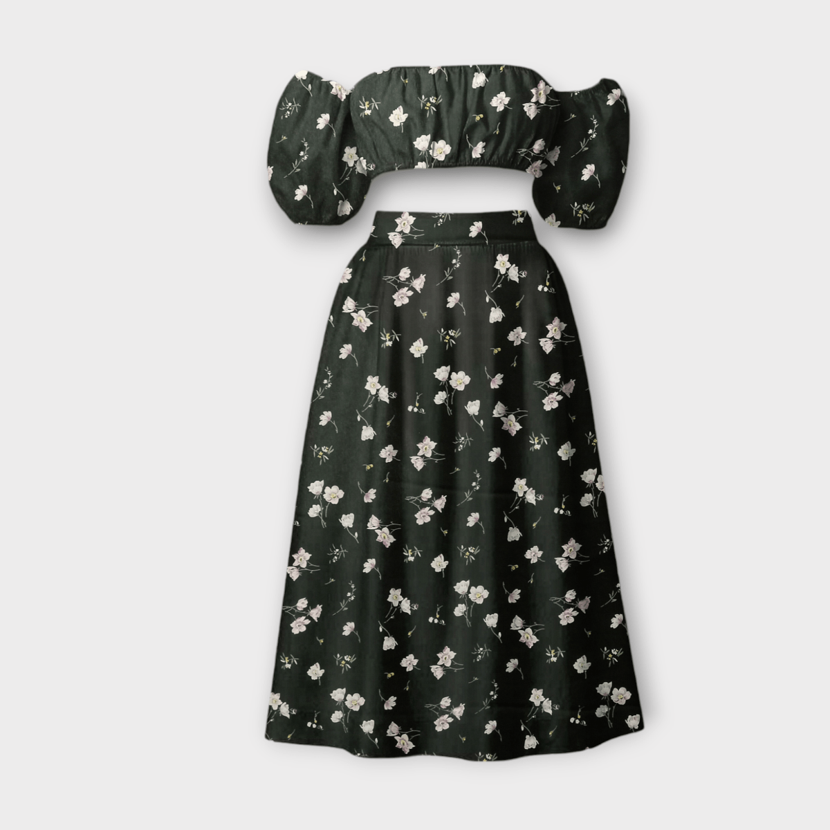 ست نیم تنه آستین جدا و دامن نیم کلوش میدی کرپ نخ گل آناگالیس