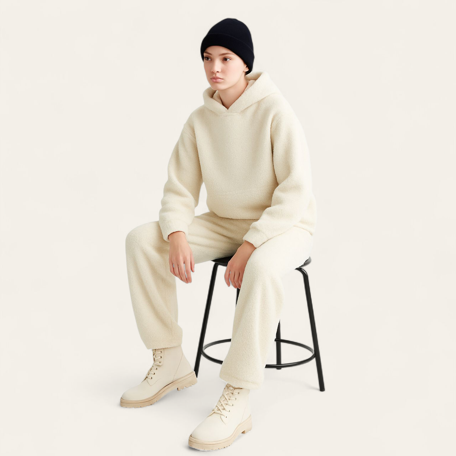 ست هودی کلاه دار و شلوار راسته خز تدی سفید