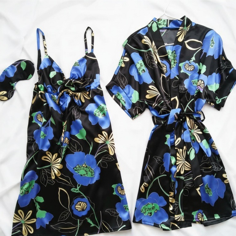 ست پیراهن بندی و ربدوشامبر ساتن گل آبی سایز 32 تا 62