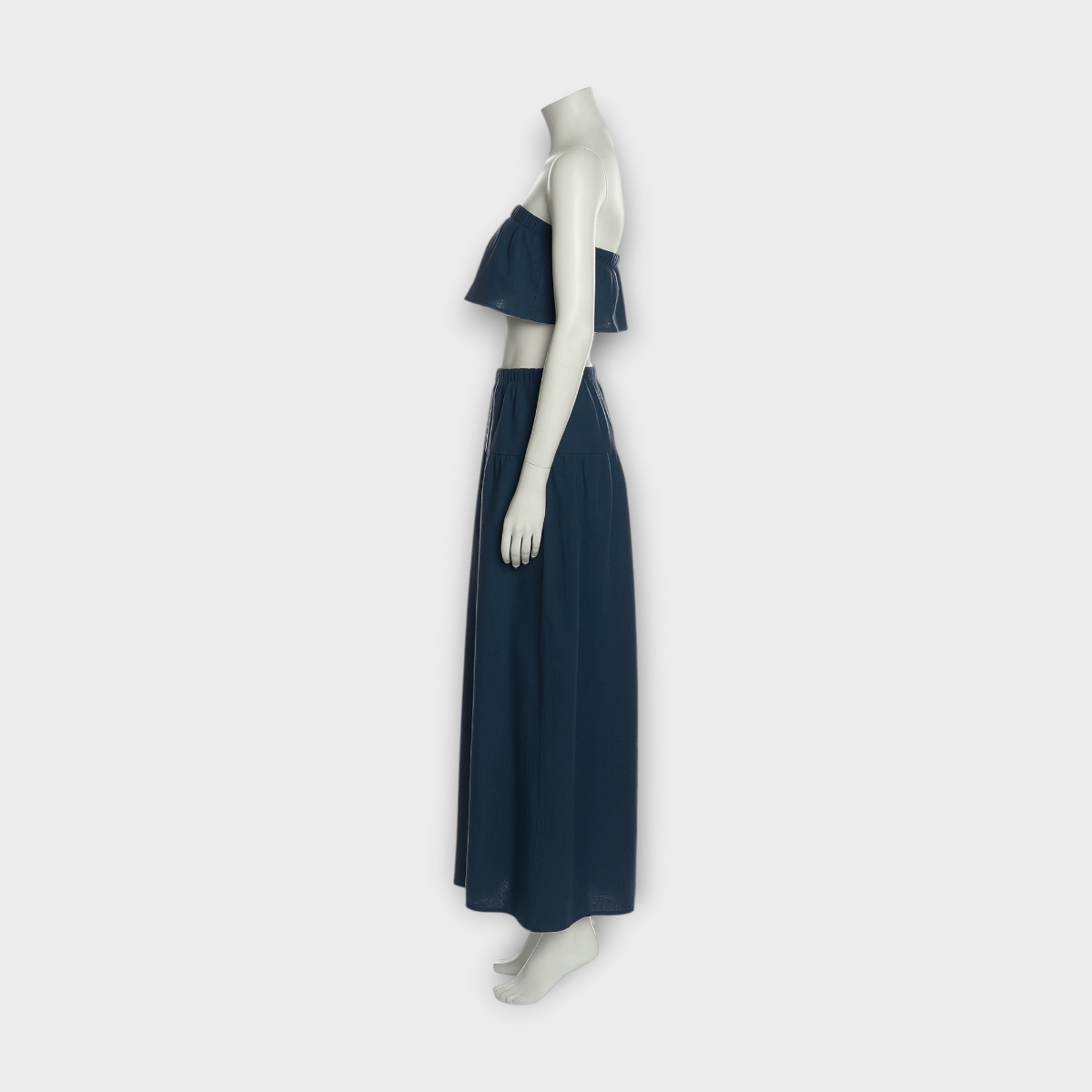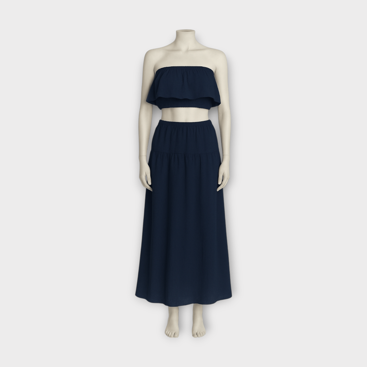 ست کراپ تاپ دکلته فلوئنس و دامن دودامنه چین دار نخی ابروبادی آبی نفتی