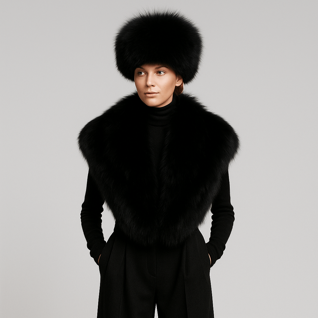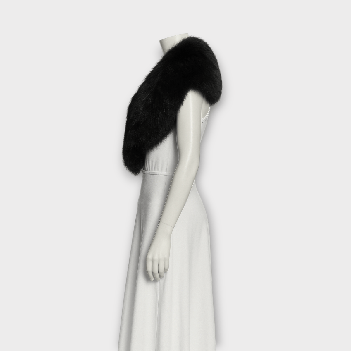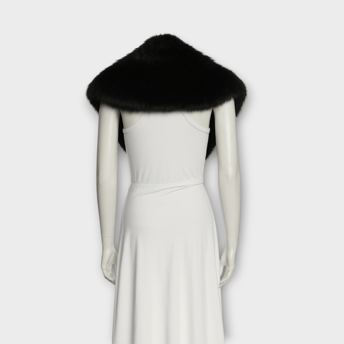 - شال خز مثلثی مشکی دارای پهنای بالا برای محافظت در هوای سرد است.
