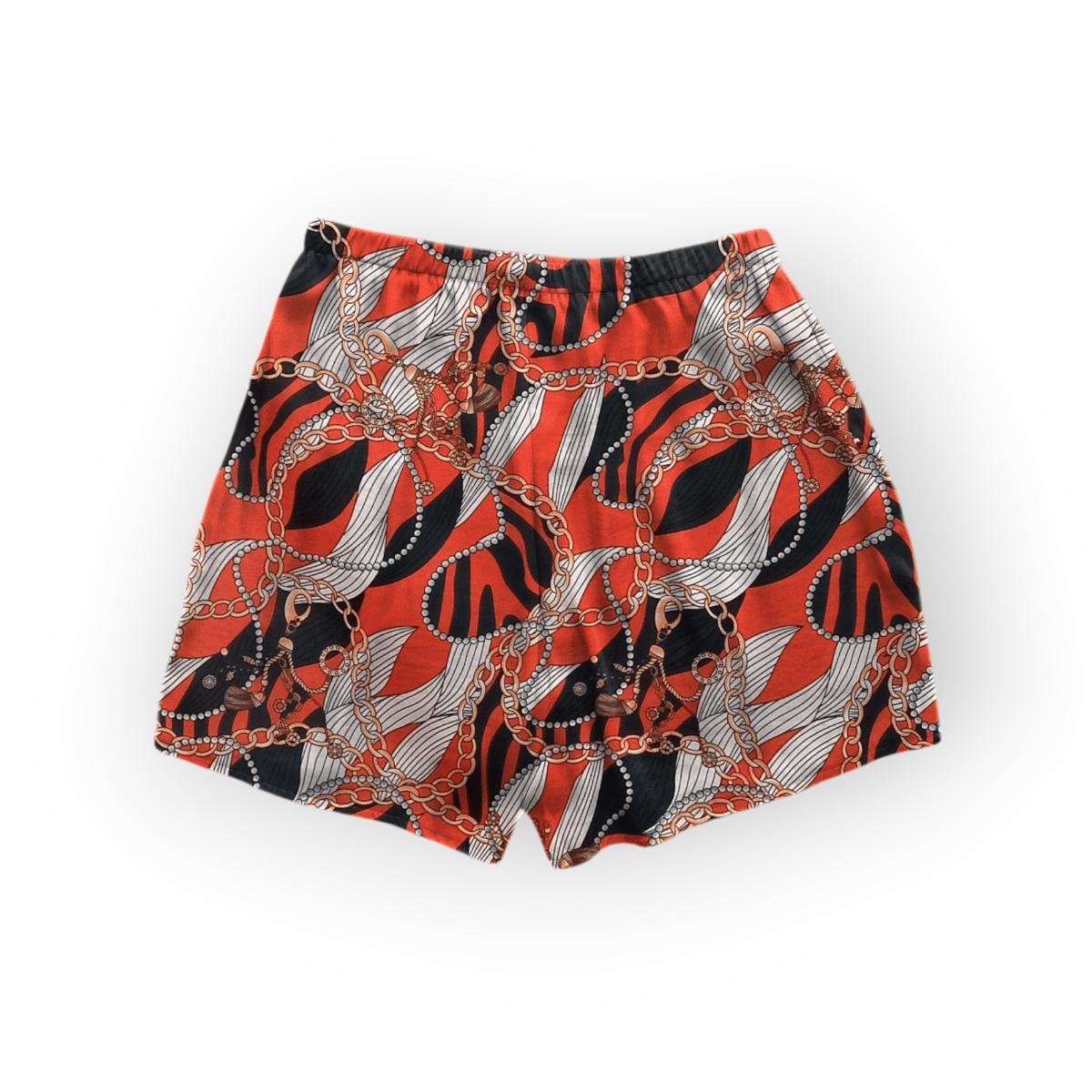 شلوارک کوتاه کمرکش طرح زنجیر با زمینه قرمز کرپ نخ