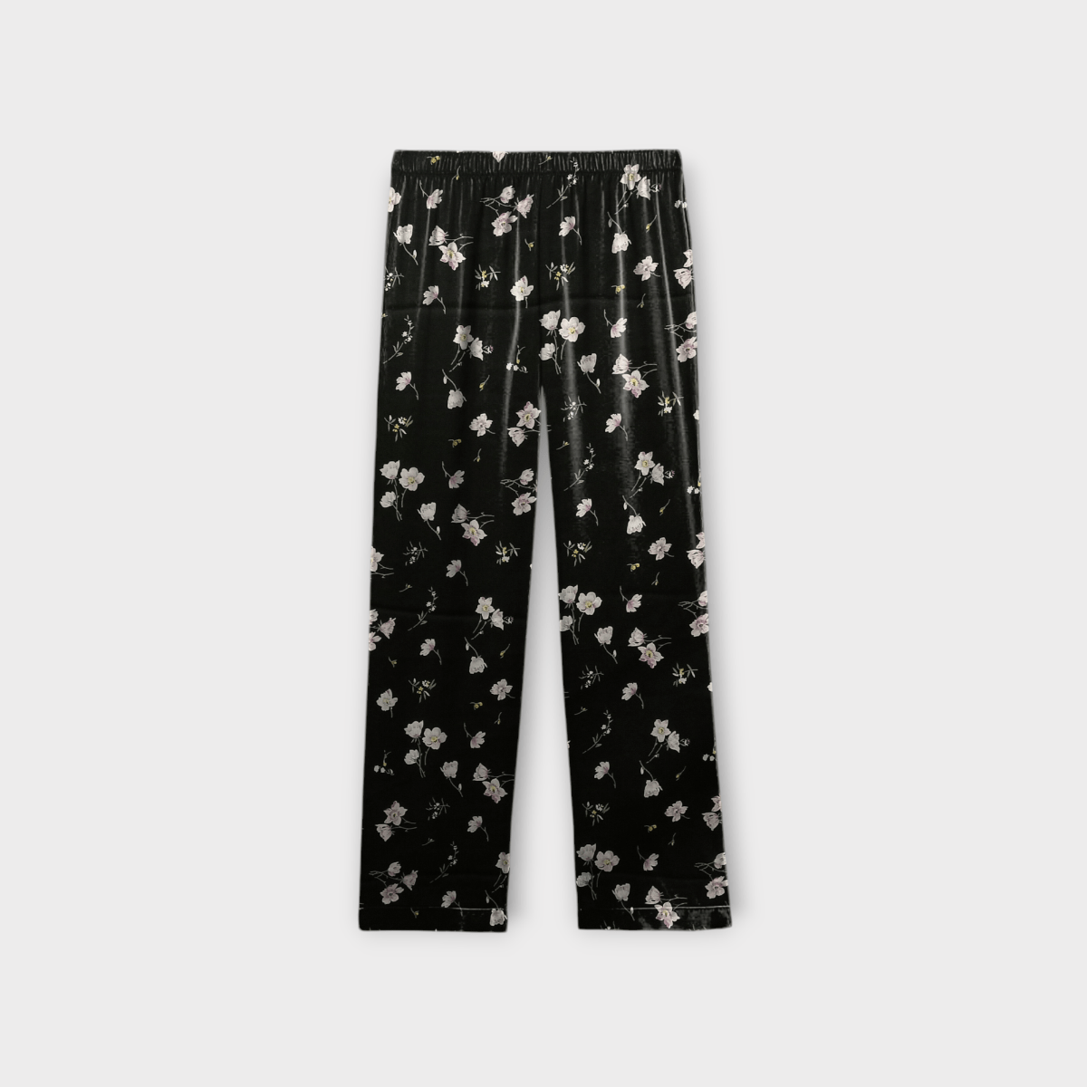 شلوار راسته گلدار کمرکش کرپ نخ گل آناگالیس با زمینه مشکی