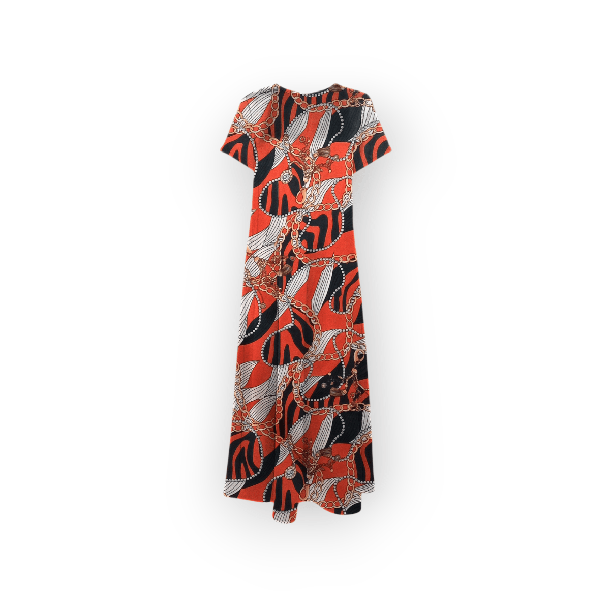 پیراهن بلند آزاد طرح زنجیر با زمینه قرمز آستین کوتاه کرپ نخ