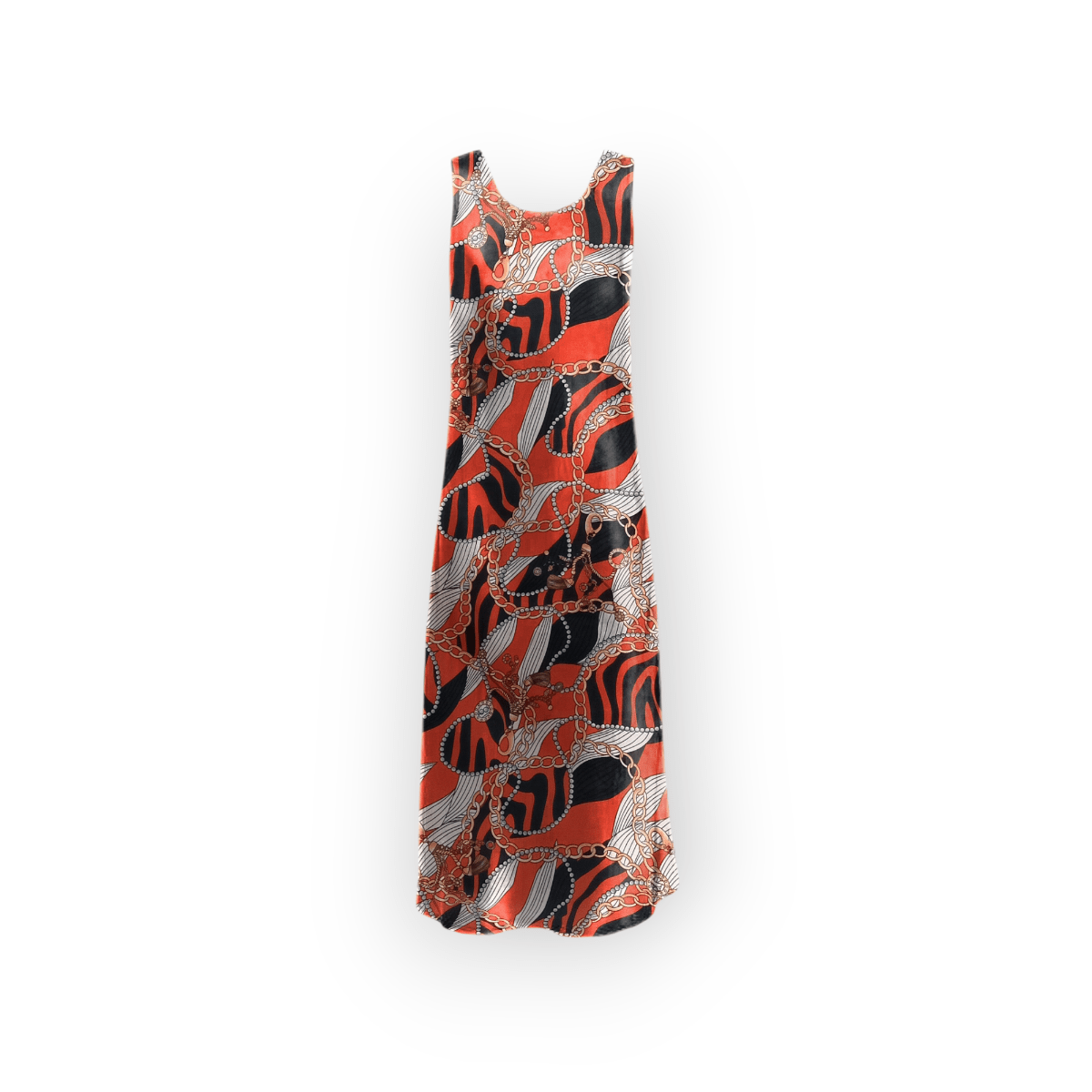 پیراهن بلند طرح زنجیر با زمینه قرمز آستین حلقه ای کرپ نخ قد 125cm سایز 32 تا 62