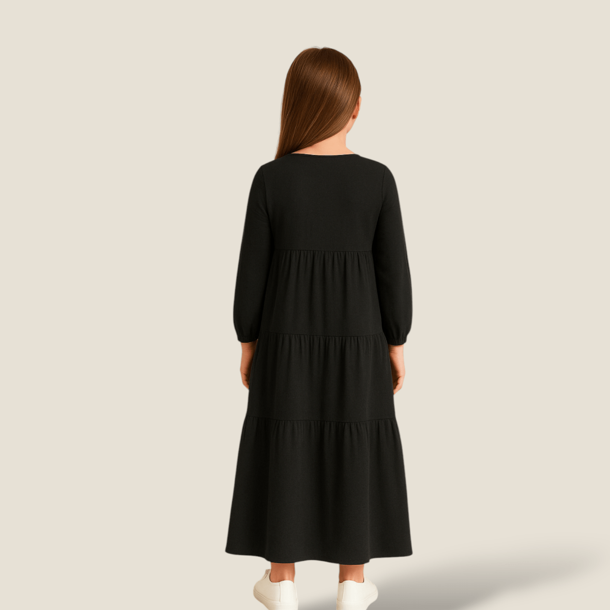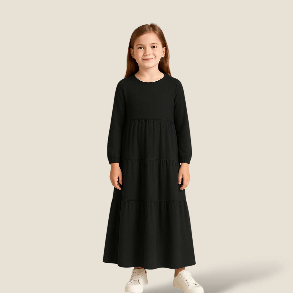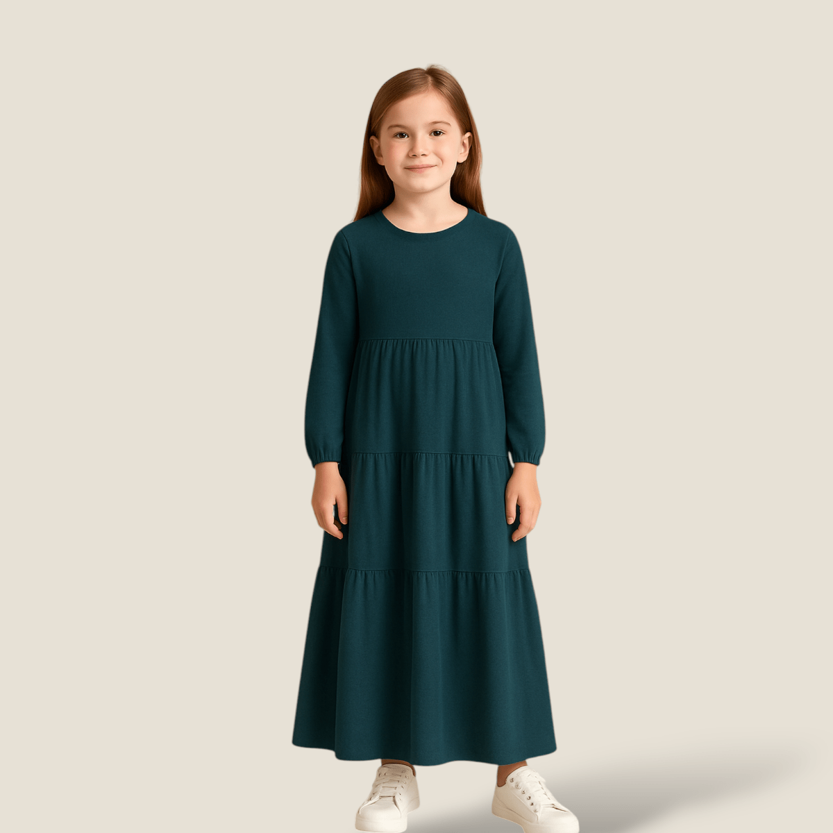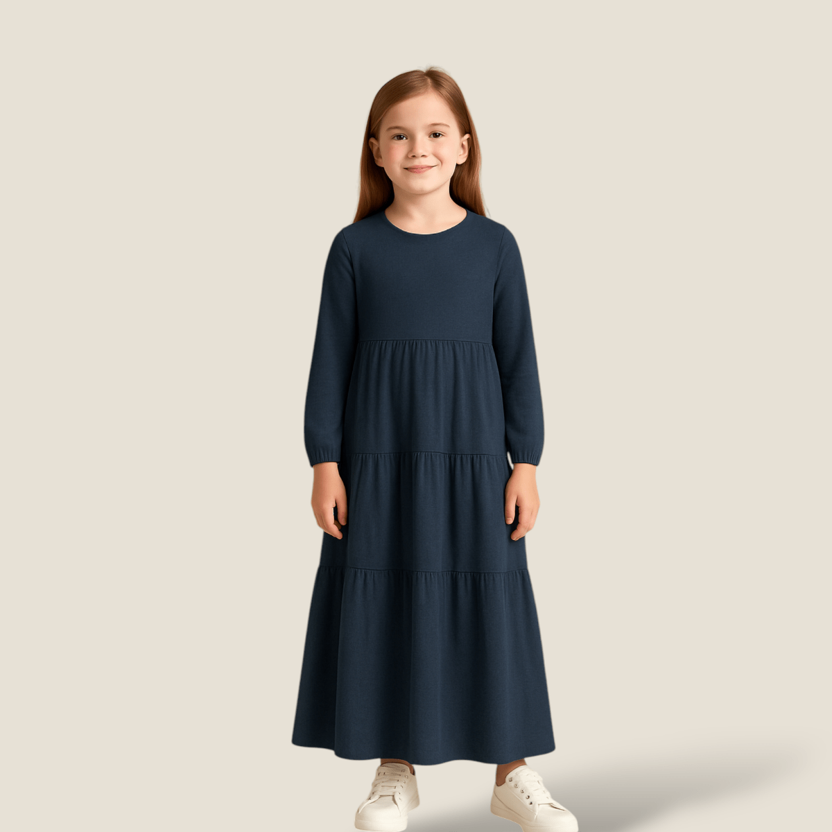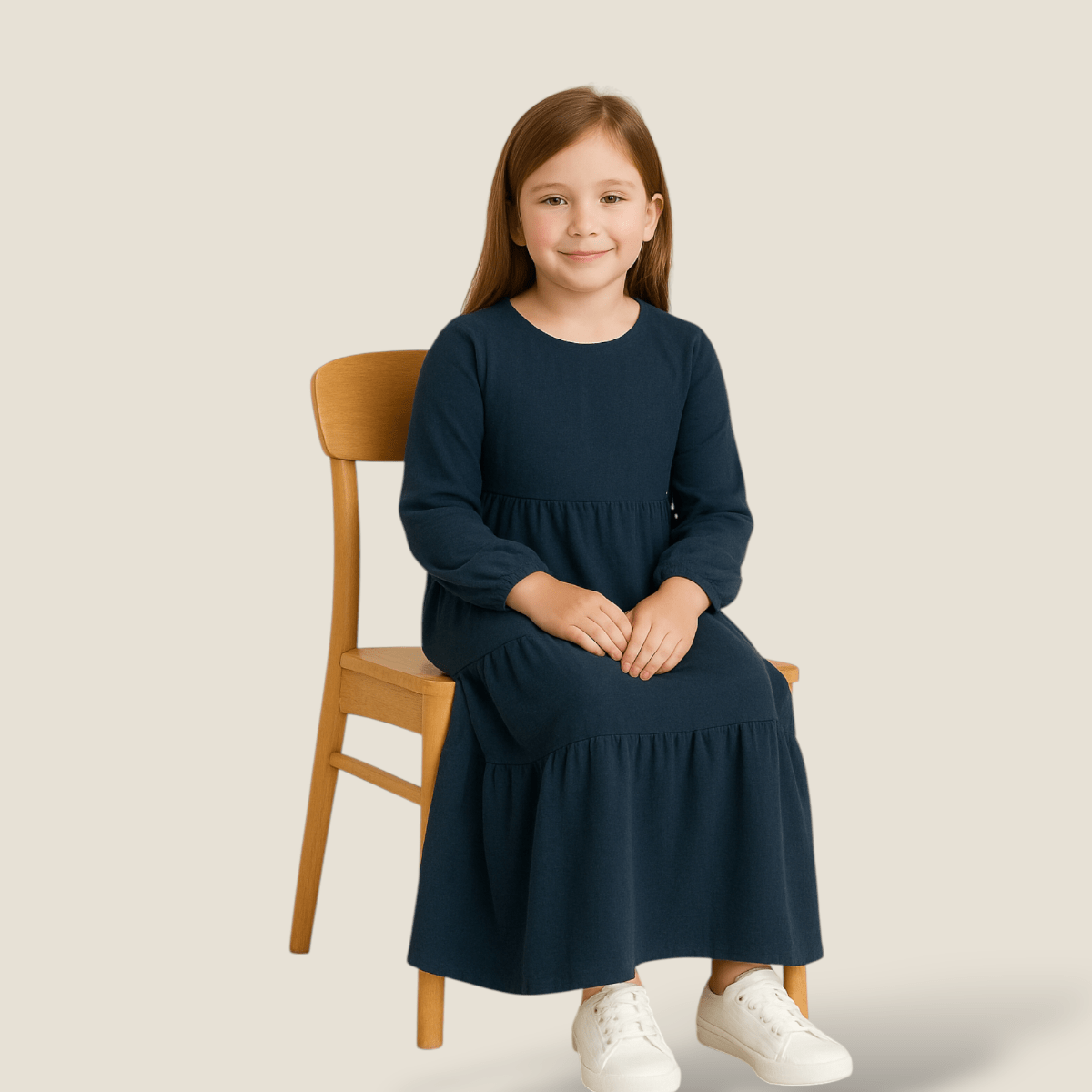 پیراهن بلند کودک سه دامنه آستین بلند نخی ابروبادی آبی نفتی 2 تا 11 سال (رنگبندی موجود)