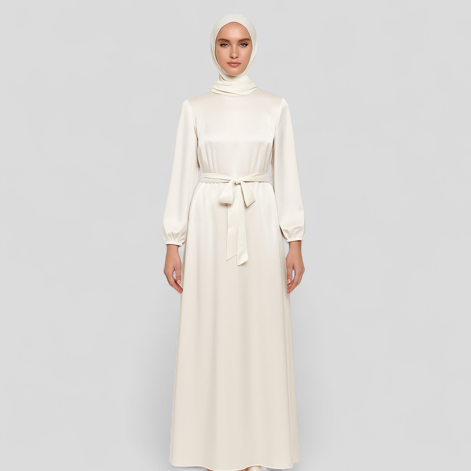 پیراهن فرمالیته عروس بلند ساتن سفید کمربنددار آستین پفی