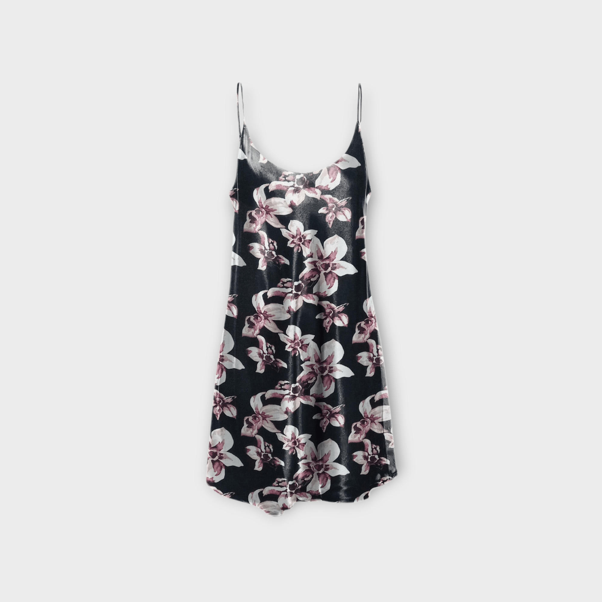 پیراهن کوتاه بندی گلدار گل لیلیوم با زمینه مشکی یقه گرد کرپ نخ پفکی