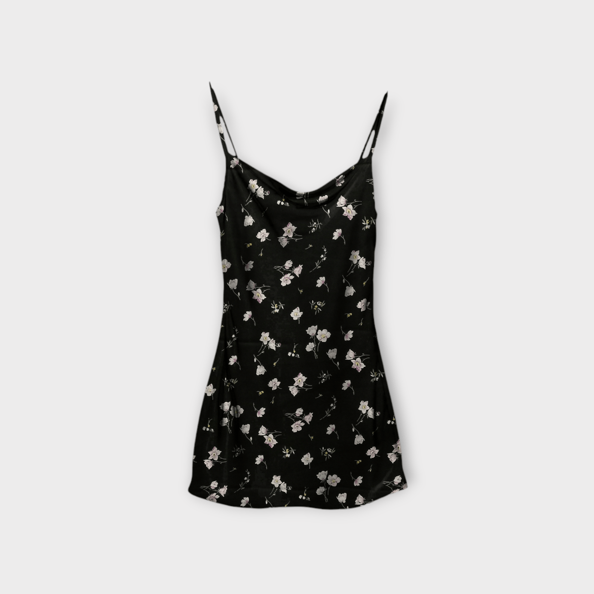 پیراهن کوتاه یقه شل گلدار گل آناگالیس با زمینه مشکی اسلپ کرپ نخ