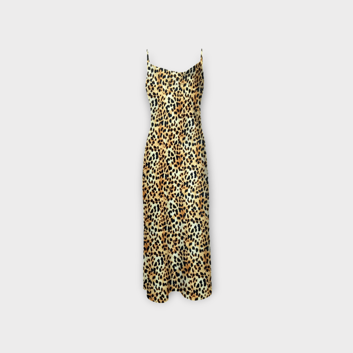 پیراهن یقه شل پلنگی بلند بندی اسلپ کرپ نخ قد 125cm