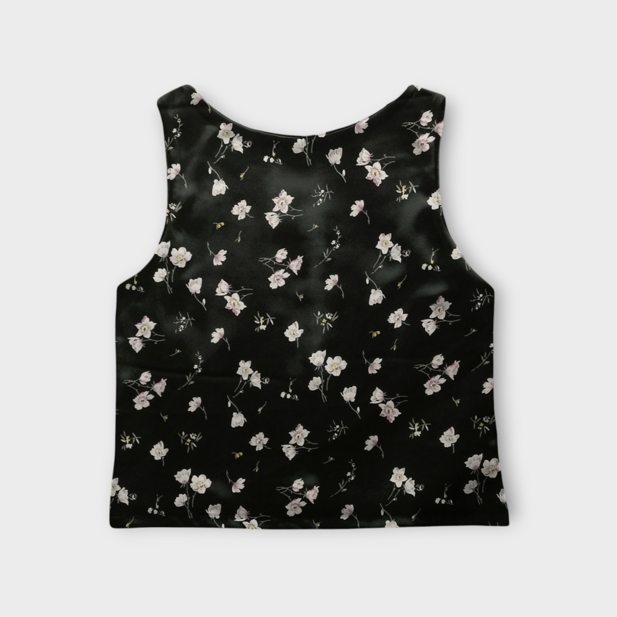 کراپ تاپ گلدار آستین حلقه ای کرپ نخ گل آناگالیس با زمینه مشکی